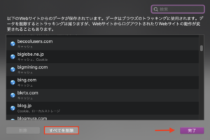 ※commandキー(⌘)を押しながら削除したい項目をクリックすると複数選択ができます。最後は「削除」ボタンをクリックすれば必要なサイトのデータを残せます。