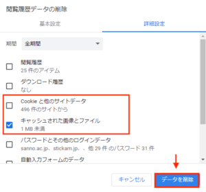 3.「詳細設定」タブで、「Cookieと他のサイトデータ」と「キャッシュされた画像とファイル」にチェックを入れ、「データを削除」をクリックする