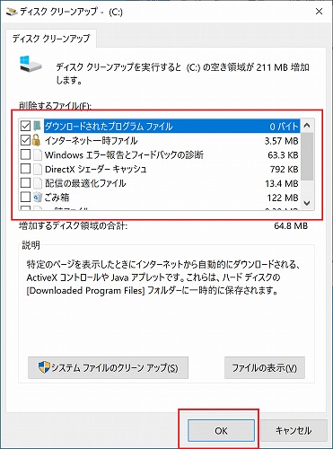 5. [ディスククリーンアップ]ダイアログボックスでファイルを選択し、[OK]をクリックして削除します。