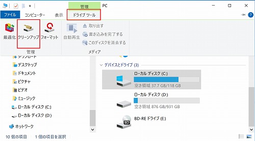 4. リボンの[ドライブツール]を選択し、[クリーンアップ]をクリックします。